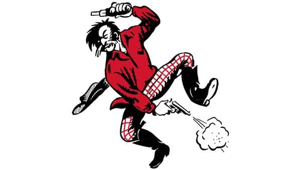 This was the original logo of the San Francisco 49ers, created in 1946. Unlike their modern logo, this design featured a man holding a sidearm in one hand and a bottle in the other.