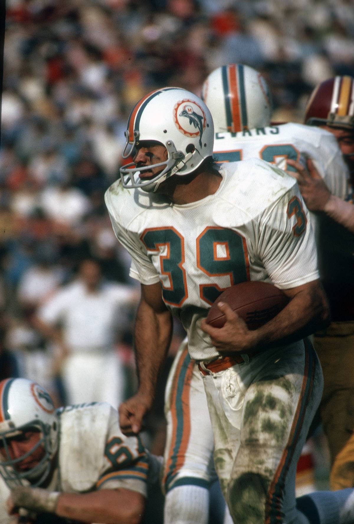This was the original logo for the Miami Dolphins, used from 1966 to 1974. It features a green dolphin wearing a football helmet with an "M" inside an orange circle.