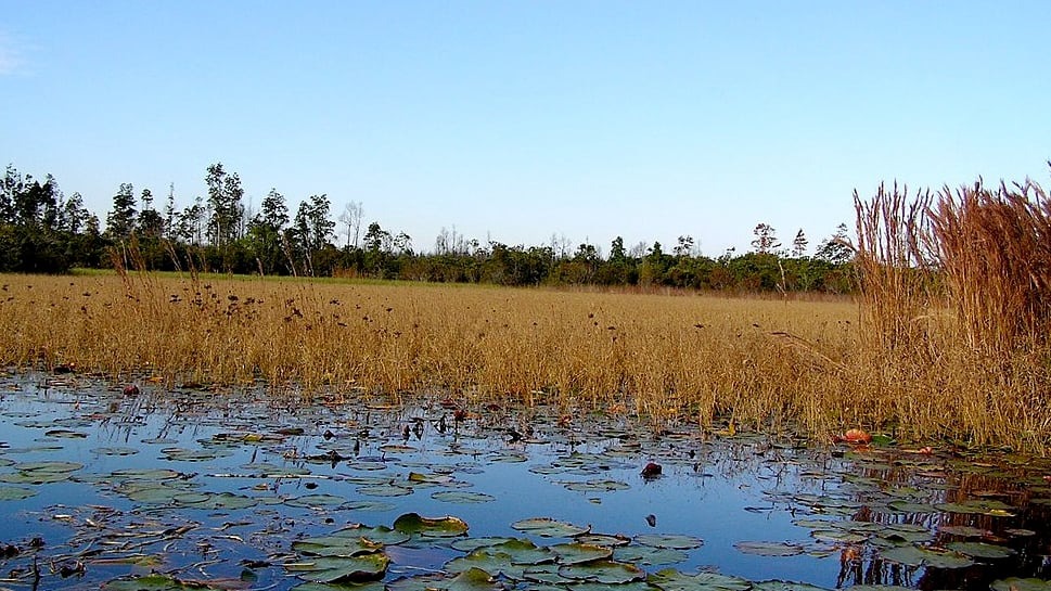 The Okefenokee Swamp, spanning 438,000 acres, is a narrow peat swamp located on the Georgia-Florida border in the United States. Recognized as one of Georgia's Seven Natural Wonders, it was designated a National Natural Landmark in 1974.