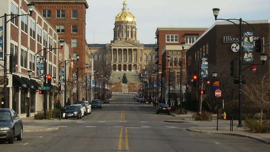 Which state is home to Des Moines, a major insurance hub in the United States, as well as a strong publishing and financial services sector?