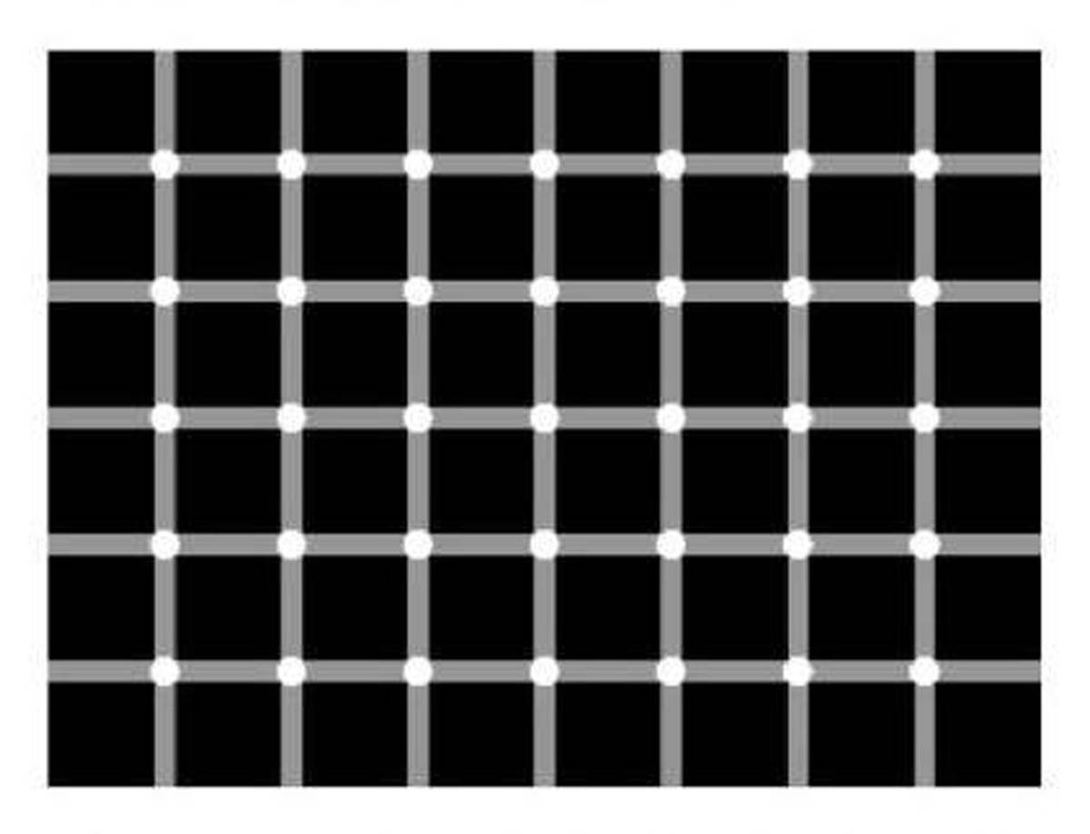 This is known as the scintillating grid illusion, where viewers perceive grey dots that seem to appear and disappear randomly at the intersections of a grid. In reality, the dots are white, and the illusion fades depending on the viewer's distance from the image or when focusing on a single dot.