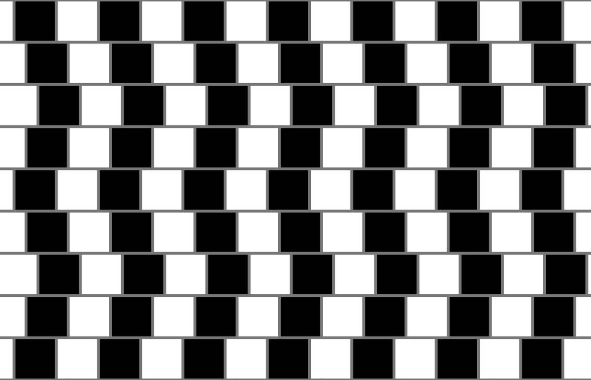 Which illusion makes parallel lines appear sloped due to alternating black and white tiles, separated by grey lines, causing the rows to seem diagonally slanted?