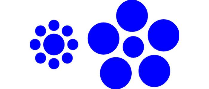 This image exemplifies the Ebbinghaus illusion, in which two circles of the same size are positioned next to each other—one surrounded by smaller circles and the other by larger circles—creating the illusion that they are different sizes.