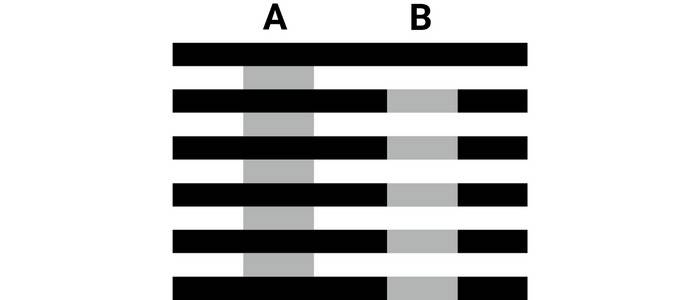 Which grey bar is darker, A or B?