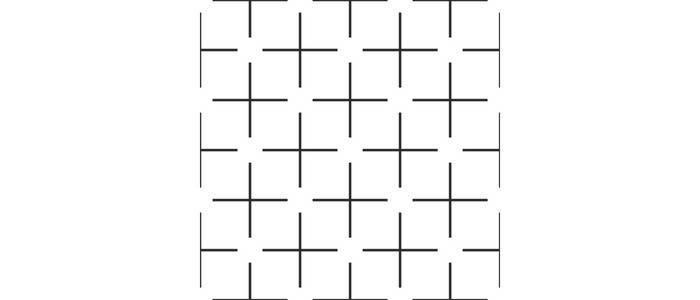 In this version of the Ehrenstein illusion, multiple lines create the appearance of squares that seem to be overlapped by circles, which look brighter than the background. These circles also give the impression of floating above the background, even though everything is the same shade of white.