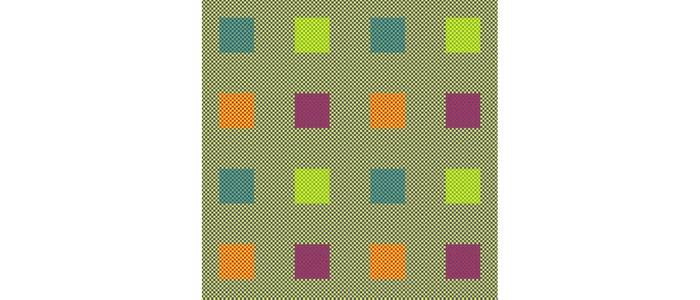 This illusion, created by Akiyoshi Kitaoka, features four squares in different colors set against what appears to be a grey background. However, the background is actually made up of tiny yellow and grey squares, similar to how colors are displayed on a TV screen.